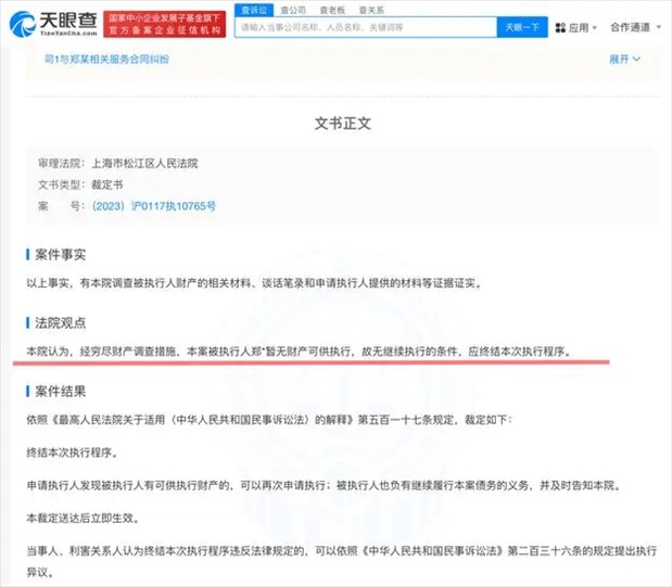·近日,演員鄭爽與海寧東開之星影視投資有限公司合同糾紛案件新增執(zhí)行裁定書。經(jīng)窮盡財(cái)產(chǎn)調(diào)查措施,法院認(rèn)定鄭爽無財(cái)產(chǎn)可供執(zhí)行。