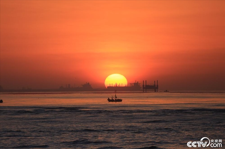 近日,山東省日照市,一輪紅日從海平面緩緩升起,遠(yuǎn)處的遠(yuǎn)洋巨輪、早起捕魚的漁船與紅日相互映襯,構(gòu)成了一幅唯美的春天海上日出畫卷。?