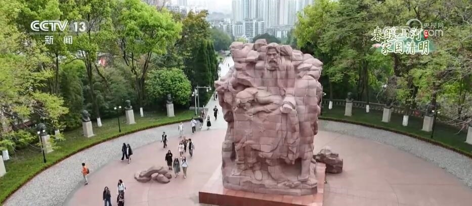 這里是位于重慶市沙坪壩區(qū)的歌樂山烈士陵園。1939年至1949年,以渣滓洞、白公館為主的重慶軍統(tǒng)集中營是國民黨囚禁和屠殺中共黨員、抗日愛國將領(lǐng)、民主人士及其他革命志士的秘密監(jiān)獄。重慶解放后,人民政府將犧牲的300多名英烈遺骸合葬于此,并于1954年建成烈士墓園和烈士紀(jì)念碑。在烈士陵園中,聳立著一座由438塊紅色花崗石組成的烈士群雕。人們來到這里獻花祭掃、默哀緬懷,汲取砥礪前行的力量。