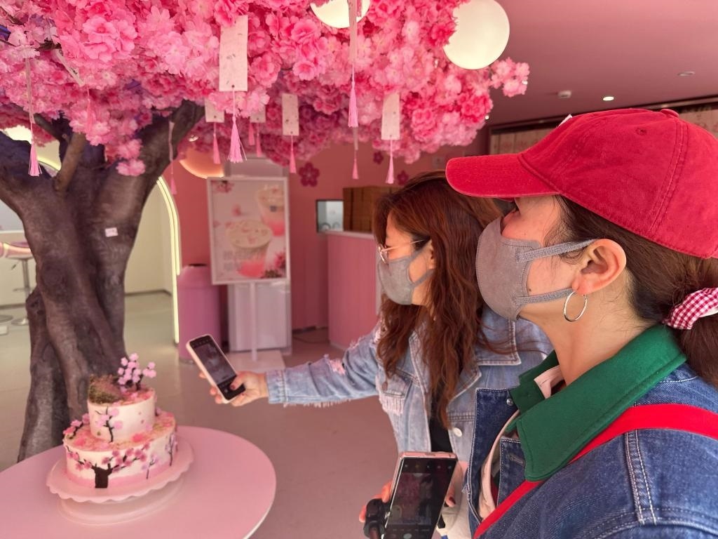 游客“打卡”北京市玉淵潭公園內(nèi)的甜品店。新華社記者 楊淑君 攝