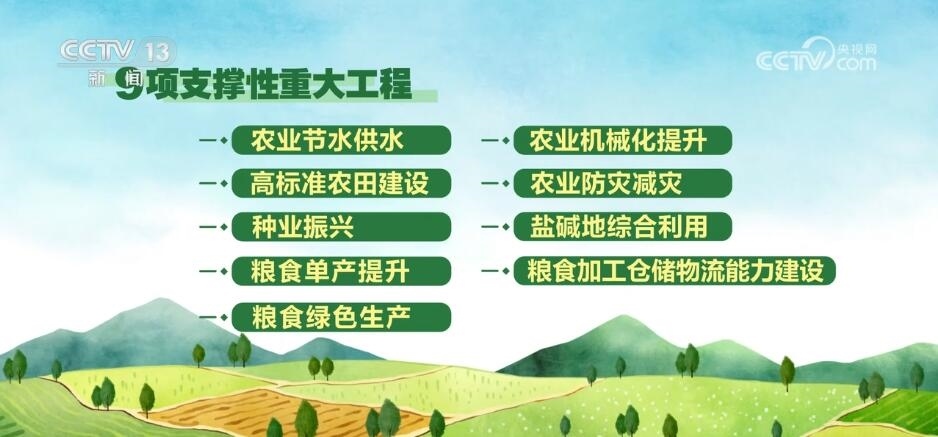 與此同時,《方案》還圍繞糧食生產(chǎn)的關(guān)鍵領(lǐng)域和薄弱環(huán)節(jié),謀劃部署了農(nóng)業(yè)節(jié)水供水、高標(biāo)準(zhǔn)農(nóng)田建設(shè)、種業(yè)振興、糧食單產(chǎn)提升、糧食綠色生產(chǎn)、農(nóng)業(yè)機(jī)械化提升、農(nóng)業(yè)防災(zāi)減災(zāi)、鹽堿地綜合利用、糧食加工倉儲物流能力建設(shè)等9項(xiàng)支撐性重大工程。