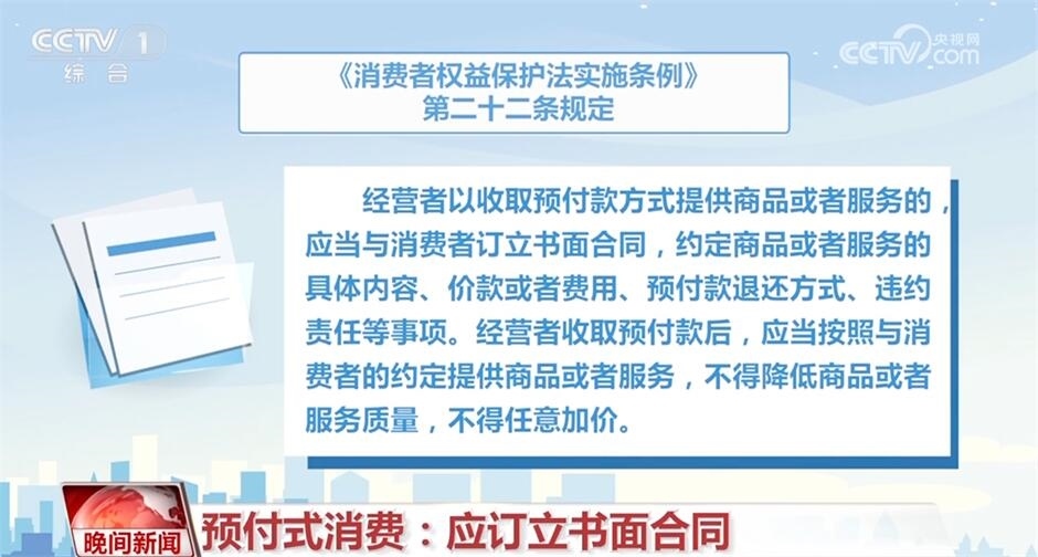 《消費者權(quán)益保護法實施條例》第二十二條規(guī)定,經(jīng)營者以收取預(yù)付款方式提供商品或者服務(wù)的,應(yīng)當(dāng)與消費者訂立書面合同,約定商品或者服務(wù)的具體內(nèi)容、價款或者費用、預(yù)付款退還方式、違約責(zé)任等事項。經(jīng)營者收取預(yù)付款后,應(yīng)當(dāng)按照與消費者的約定,提供商品或者服務(wù),不得降低商品或者服務(wù)質(zhì)量,不得任意加價。