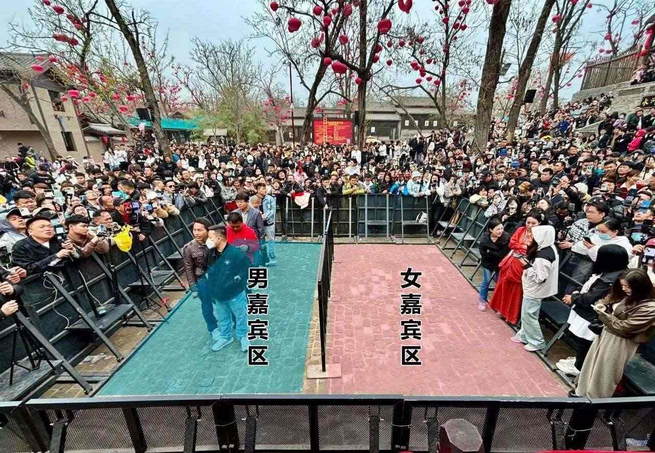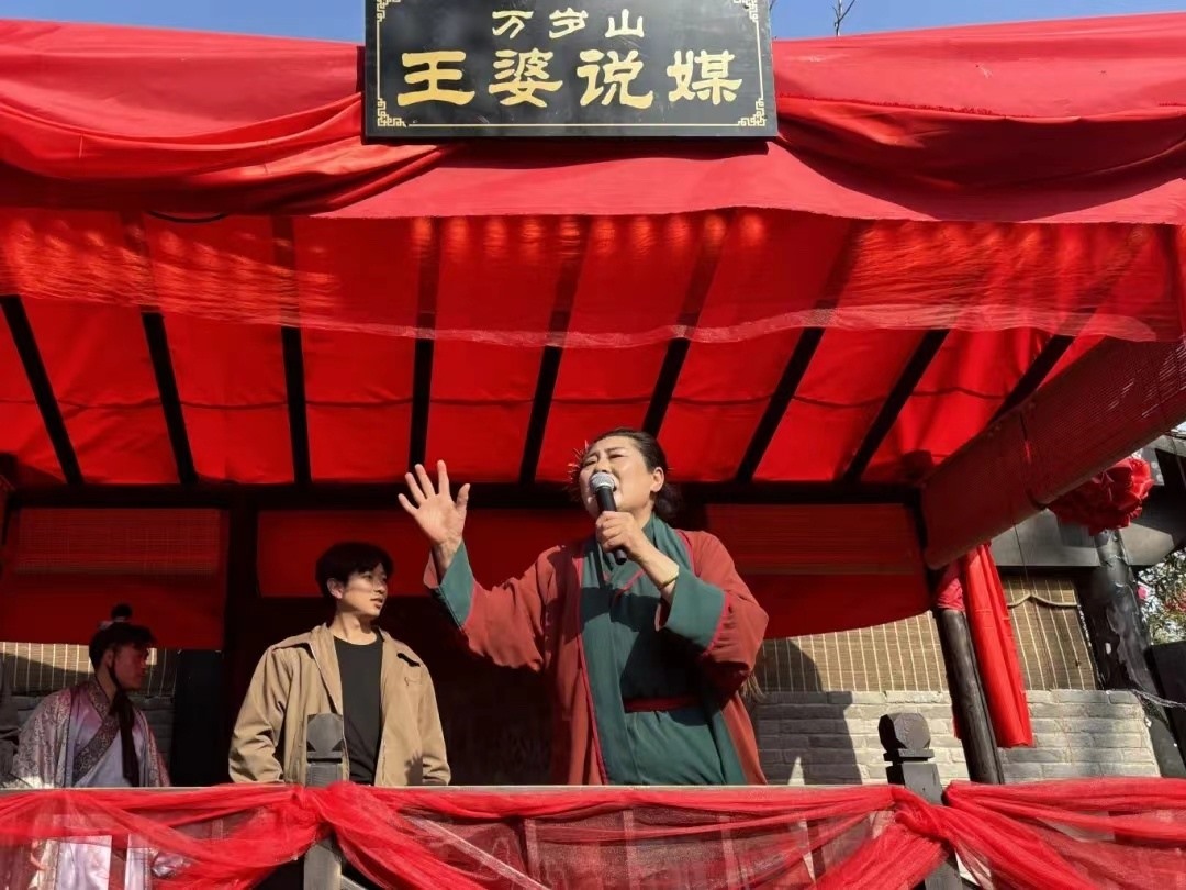 占地面積500余畝的萬歲山武俠城景區(qū)每天有上百場節(jié)目上演,《王婆說媒》原本是一場只有十分鐘的“下飯小菜”,趙梅憑脫口而出的金句和高超的互動技巧讓節(jié)目時長一延再延。當(dāng)反感被催婚的年輕人也開始興致盎然地關(guān)注“王婆說媒”時,趙梅打趣說:“人人都說單身好,人人都往開封跑。”