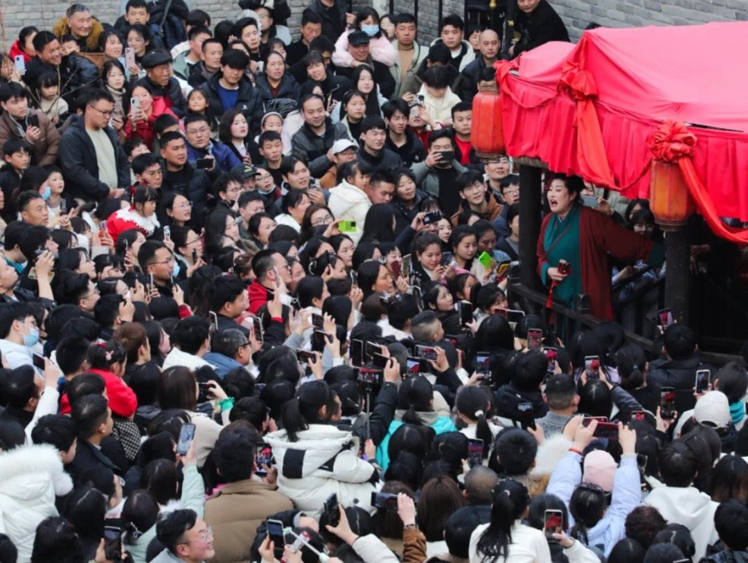 這個春日,午后的萬歲山武俠城景區(qū)水滸街王婆茶館前,熙熙攘攘的人群包圍了舞臺三面,每個能看到臺上的縫隙都被填滿,水泄不通,一旁茶樓二層的好位置已早早被預(yù)訂,有人不遠(yuǎn)千里只為一睹真容。