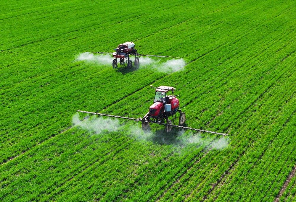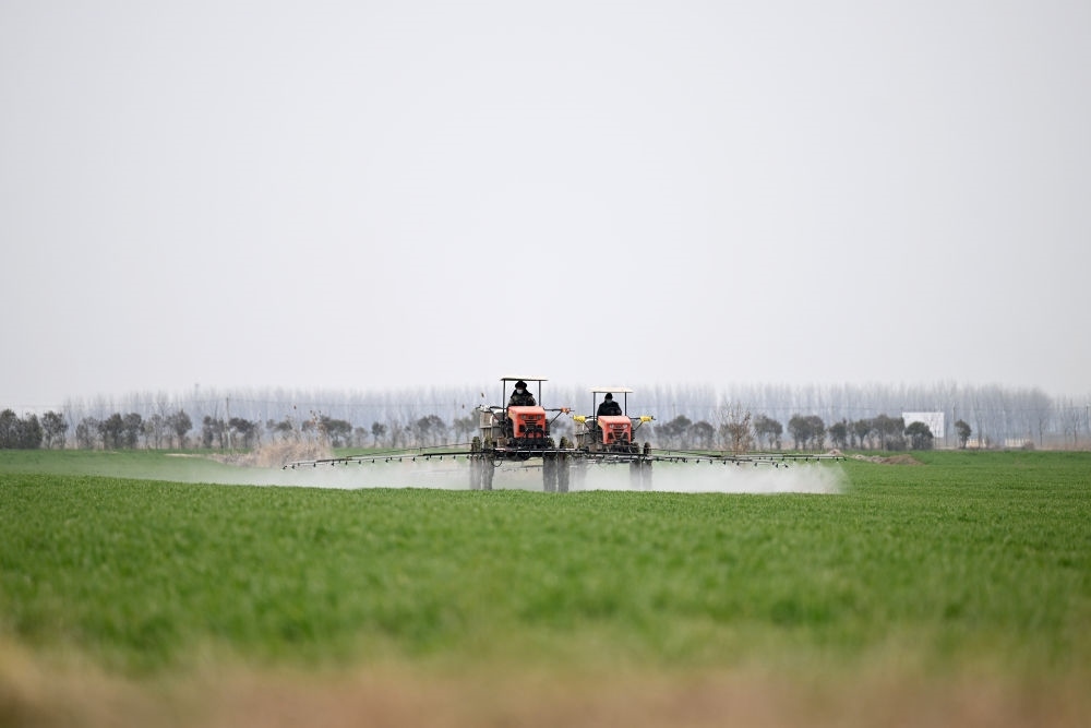 2024年3月13日,在安徽省蚌埠市五河縣頭鋪鎮(zhèn),農(nóng)民駕駛農(nóng)機給小麥噴灑農(nóng)藥。新華社記者 黃博涵 攝