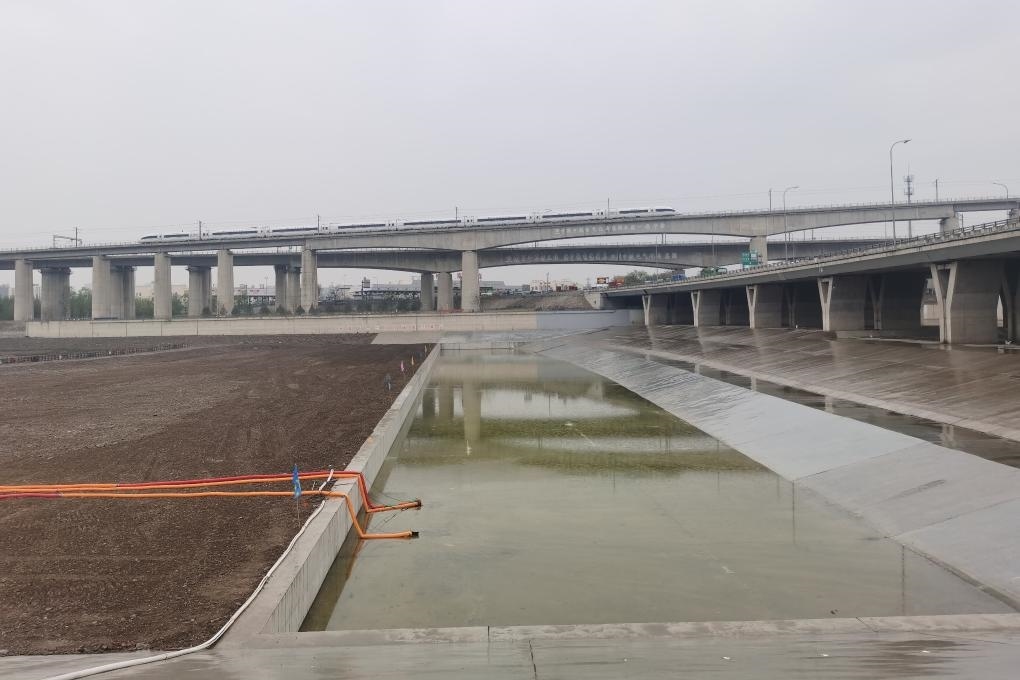 永定河京港澳高速公路大橋南,大寧調(diào)蓄水庫(kù)水毀修復(fù)工程施工現(xiàn)場(chǎng),記者看到,新建的消力池已經(jīng)建好,所有實(shí)體工程已經(jīng)完工,一些工人正在做收尾清理工作。
