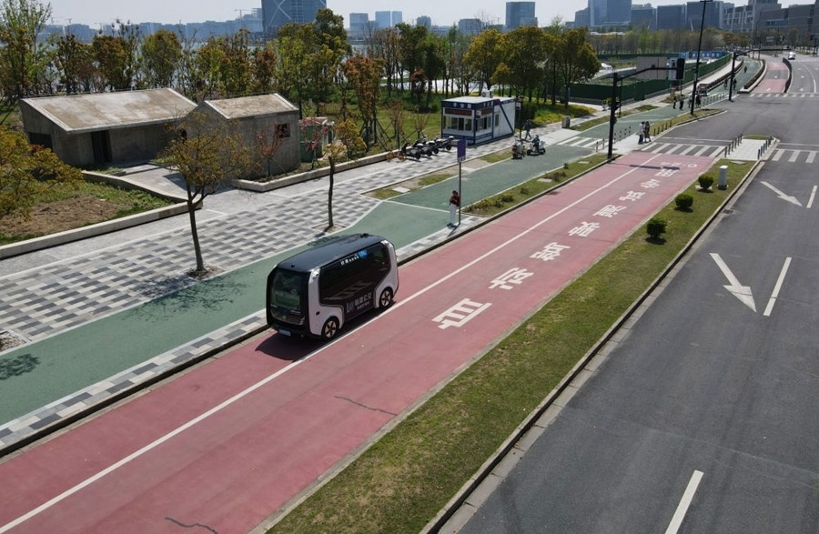 在中國(上海)自由貿(mào)易試驗區(qū)臨港新片區(qū),一輛無人駕駛汽車行駛在自動駕駛測試專用路上(無人機(jī)照片,2024年4月9日攝)。