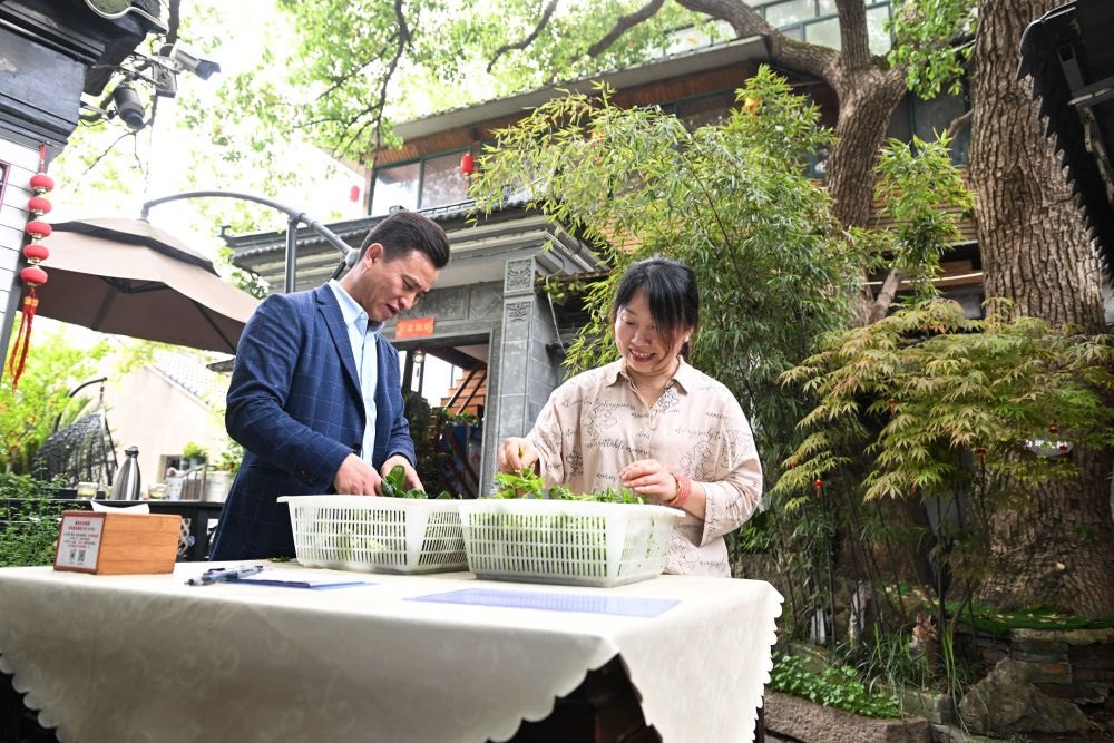 2024年4月11日,在江蘇省蘇州市吳中區(qū)金庭鎮(zhèn),退捕漁民沈雪榮和妻子沈燕燕在自家經(jīng)營的農(nóng)家樂“美味漁家蟹園”擇菜?!巴瞬逗螅纳鷳B(tài)環(huán)境越來越好,游客越來越多,我們家的農(nóng)家樂生意也越來越紅火?!鄙蜓s感慨道。