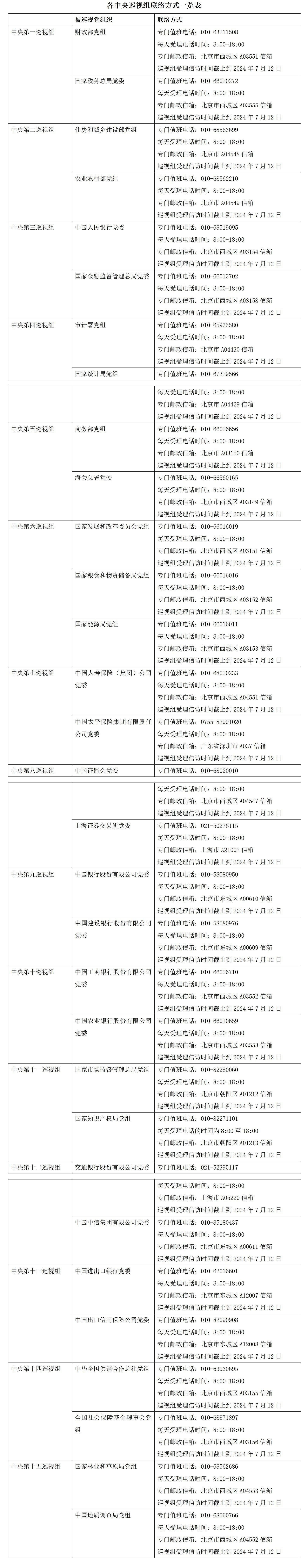 根據(jù)黨中央關(guān)于巡視工作統(tǒng)一部署,二十屆中央第三輪巡視的15個巡視組陸續(xù)開始進駐被巡視單位。目前,中央巡視組已進駐31家單位并公布了聯(lián)系方式。據(jù)了解,中央巡視組將在被巡視黨組織工作3個月左右。