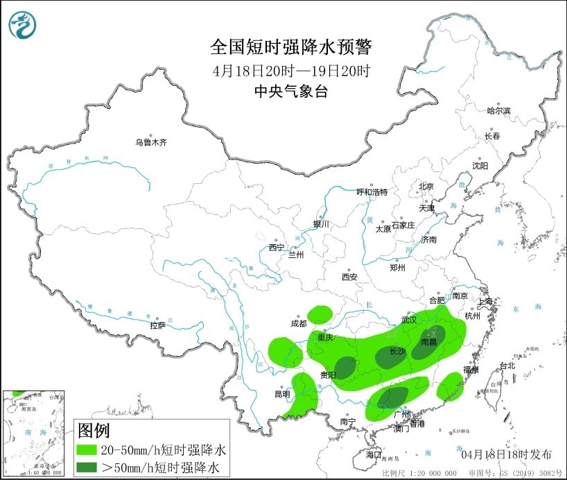 預(yù)計4月18日20時至19日20時,貴州中東部、湖南中南部、江西、浙江西南部、廣西北部、廣東北部、福建南部等地的部分地區(qū)將有8-10級雷暴大風(fēng)或冰雹天氣,其中貴州東部、湖南中南部、江西中北部、廣西東北部、廣東北部等地的部分地區(qū)將有10級以上雷暴大風(fēng),局地風(fēng)力可達(dá)11級以上;四川東部和南部、重慶南部、貴州、湖北東南部、安徽南部、湖南、江西、浙江西部、福建西北部和南部、云南東南部、廣西東北部、廣東北部等地將有小時雨量大于20毫米的短時強(qiáng)降水天氣,其中貴州東部、湖南中南部、江西中部、廣東中北部等地的部分地區(qū)最大小時雨量大于50毫米,局地可達(dá)70毫米以上。
