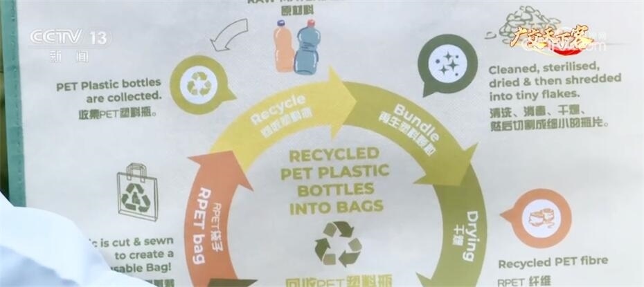 記者發(fā)現(xiàn)了一種用PET塑料瓶為原料制成的環(huán)保購(gòu)物袋。PET簡(jiǎn)稱聚酯,是一種常見的塑料材料,企業(yè)將這類塑料瓶回收后,經(jīng)過(guò)處理變成細(xì)小的瓶片,再經(jīng)融化和擠壓后變成纖維、織成布,最后就得到了一個(gè)可以循環(huán)使用的購(gòu)物袋。