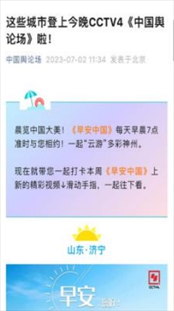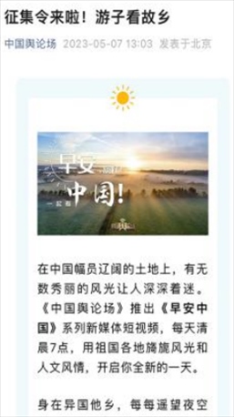 每天早7點(diǎn),新媒體用戶一起床,打開《中國輿論場(chǎng)》,美妙的音樂喚醒耳朵,美麗的風(fēng)景賞心悅目,再加上一句經(jīng)典典故,迎接美美的一天!