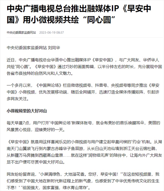 一年后的今天,《早安中國》不僅讓越來越多的網(wǎng)友在每天早晨7:00習(xí)慣性地用“早安”短視頻跟親朋好友道聲問候、來場(chǎng)“約會(huì)”,更重要的是它將總書記喜歡的典故與中國各地獨(dú)特的自然和人文景觀相結(jié)合,與海外華僑華人建立起有效連接。
