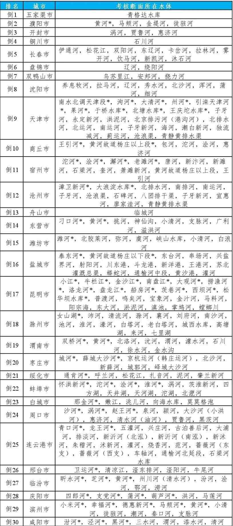 地級及以上城市國家地表水考核斷面排名