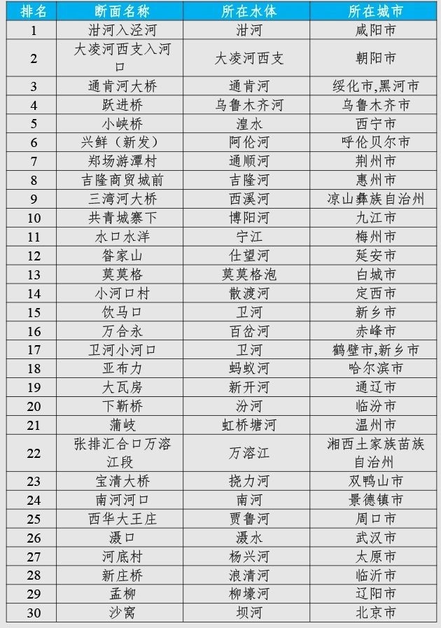 咸陽市泔河入涇河、朝陽市大凌河西支入河口和綏化市/黑河市通肯河大橋等30個國家地表水考核斷面水環(huán)境質(zhì)量變化情況相對較好(從第1名至第30名),渭南市裕西、天津市新老米店閘和玉溪市化念水庫等30個國家地表水考核斷面水環(huán)境質(zhì)量變化情況相對較差(從倒數(shù)第1名至倒數(shù)第30名)。