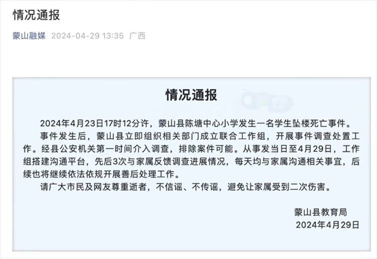 ·廣西蒙山一小學(xué)生墜樓死亡,公安機(jī)關(guān)排除案件可能。