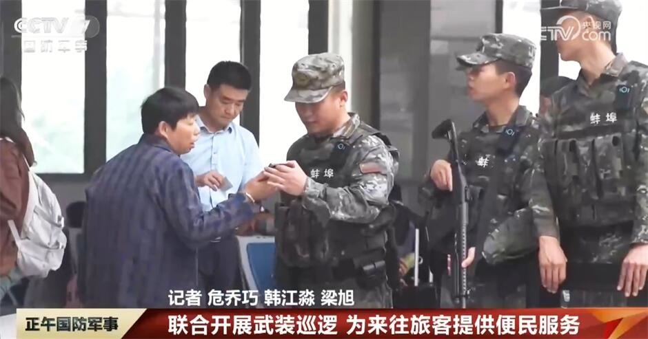 在安徽蚌埠火車站,武警官兵與公安特警聯(lián)合開展武裝巡邏,主動加大對重點區(qū)域的實時監(jiān)控和巡邏力度,在維護(hù)秩序的同時,官兵還耐心為廣大旅客答疑解惑,提供便民服務(wù)。