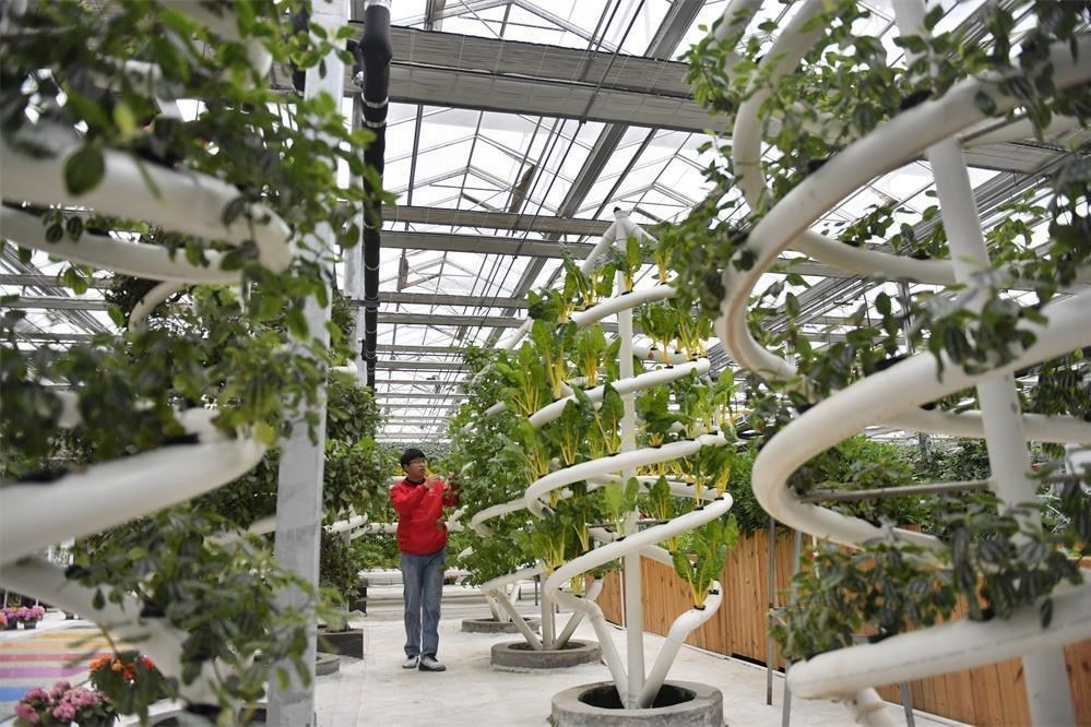 2023年5月13日,在河北曲周縣育苗產(chǎn)業(yè)園,苗樂(lè)園科技小院的學(xué)生在查看無(wú)土栽培蔬菜。