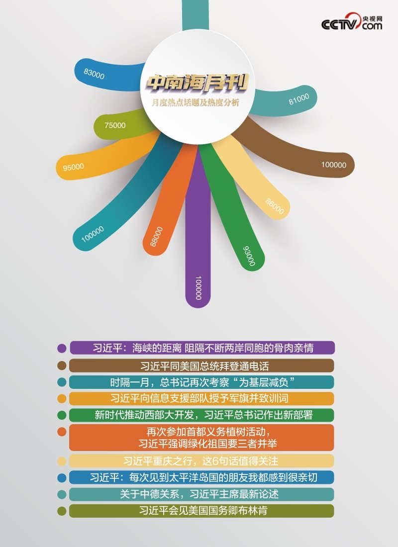 央視網(wǎng)“智聞”系統(tǒng)提取分析2024年4月全網(wǎng)時(shí)政新聞熱點(diǎn)顯示,“時(shí)隔一月,總書(shū)記再次考察‘為基層減負(fù)’”“習(xí)近平向信息支援部隊(duì)授予軍旗并致訓(xùn)詞”“習(xí)近平同美國(guó)總統(tǒng)拜登通電話”等話題備受關(guān)注。