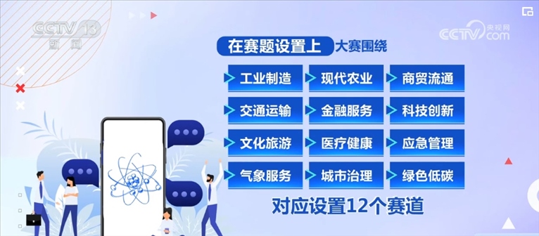 在賽題設置上,大賽圍繞工業(yè)制造、現(xiàn)代農(nóng)業(yè)、商貿(mào)流通、交通運輸、金融服務、科技創(chuàng)新、文化旅游、醫(yī)療健康、應急管理、氣象服務、城市治理、綠色低碳12個行業(yè)及領域,對應設置12個賽道。