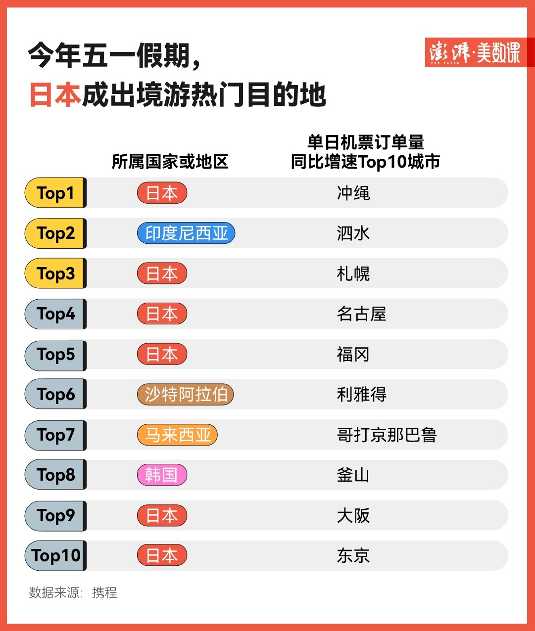 除了國內(nèi)旅游市場的火爆之外,“五一”出境游已經(jīng)加快復(fù)蘇。從攜程提供的數(shù)據(jù)看,今年“五一”假期,日本成了出境游熱門目的地——相比2023年同期,單日機票訂單量同比增速Top10的城市中,日本的沖繩、札幌、名古屋等城市分別占據(jù)了六個席位。