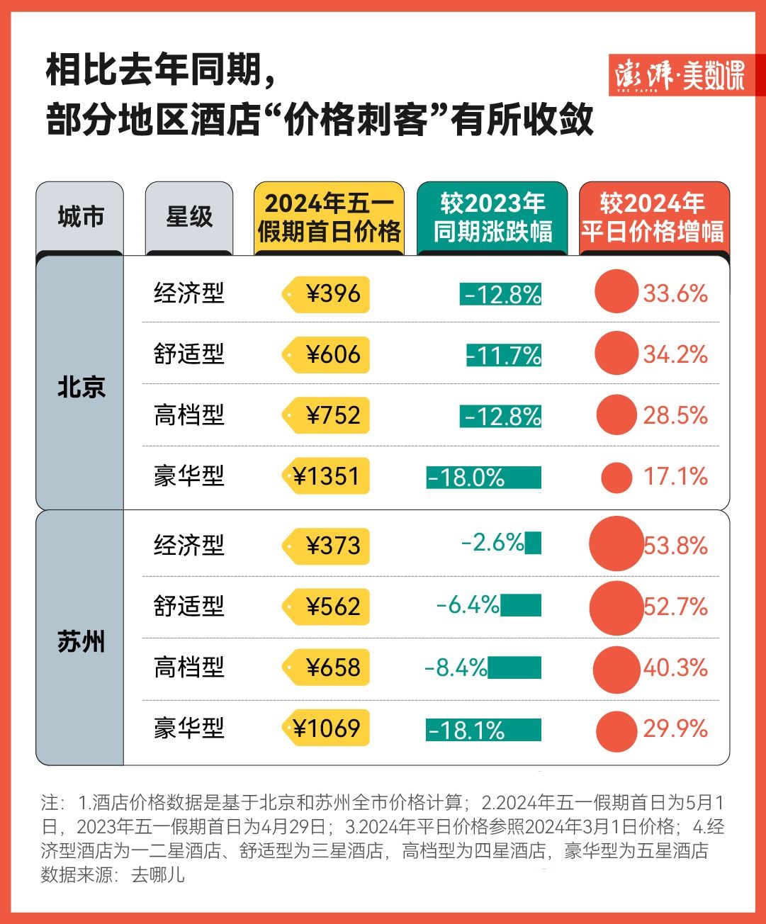 從去哪兒平臺提供的數(shù)據(jù)來看,在今年“五一”假期的首日,北京和蘇州的經(jīng)濟型酒店相比平日價格分別漲了三成和五成左右,難怪在社交媒體上總能看到“五一不是不出門,是酒店住不起”的吐槽聲。