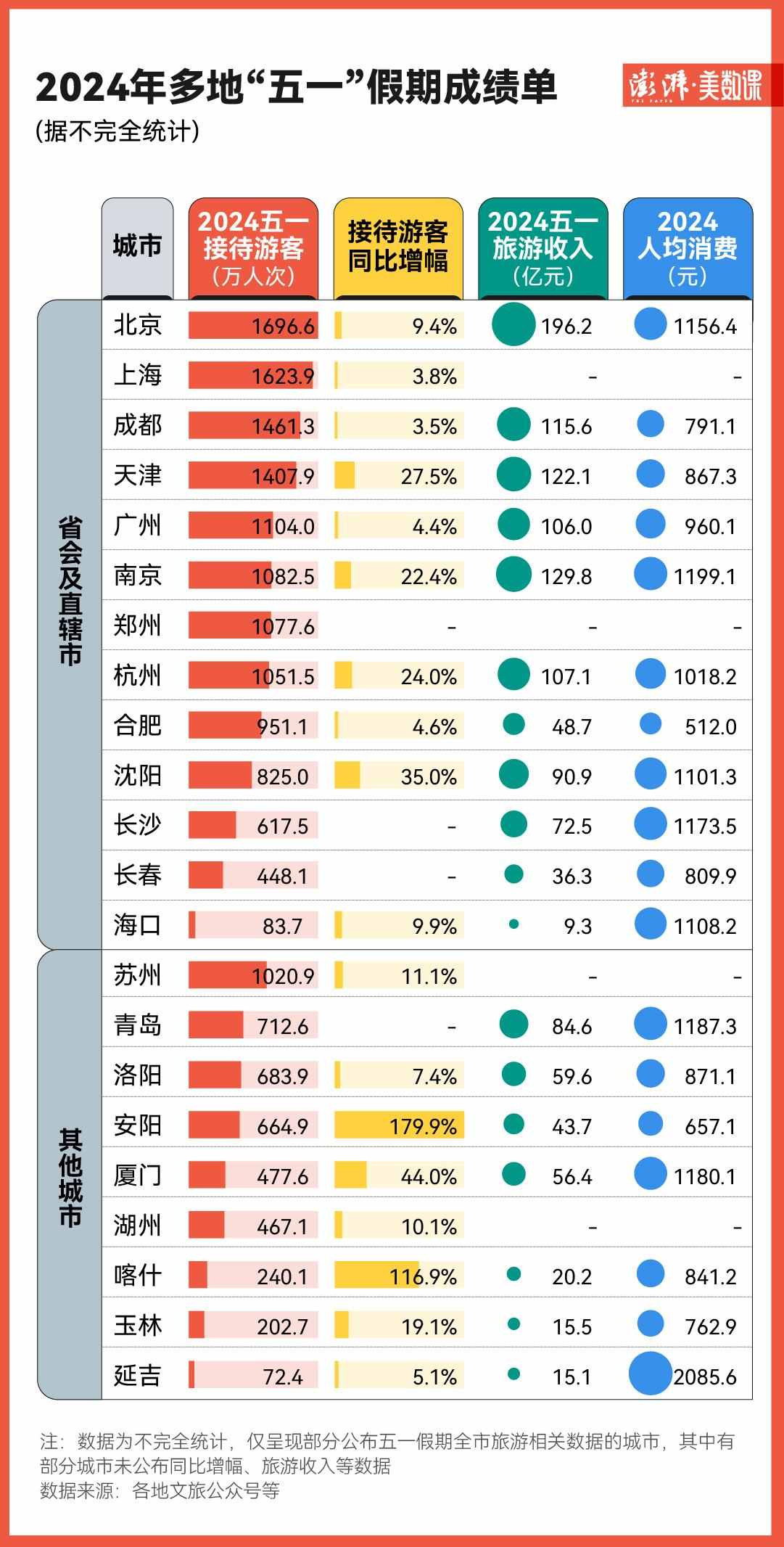 不過,像是北京、上海、成都、天津等城市依然是熱門的旅游目的地。在目前已公布“五一”假期數(shù)據(jù)的省會及直轄市中,北京、上海就以1696.6萬、1623.9萬接待游客人次名列前茅。