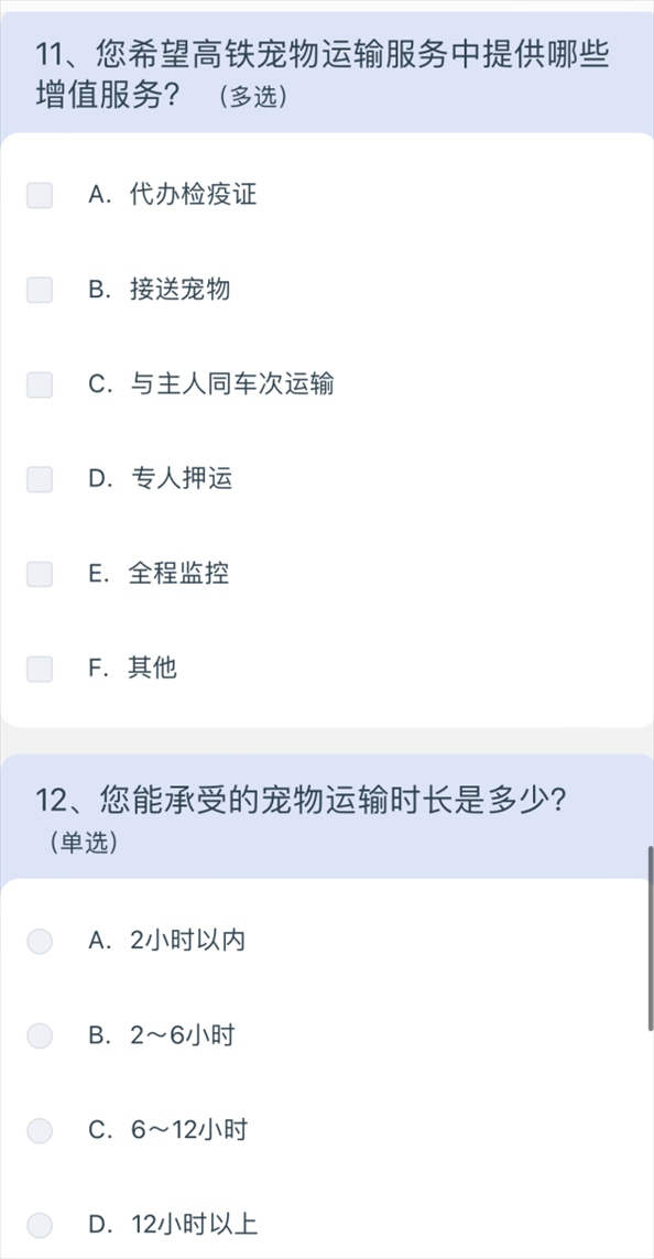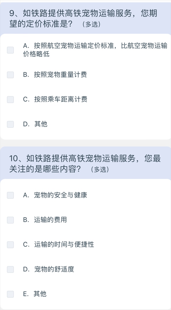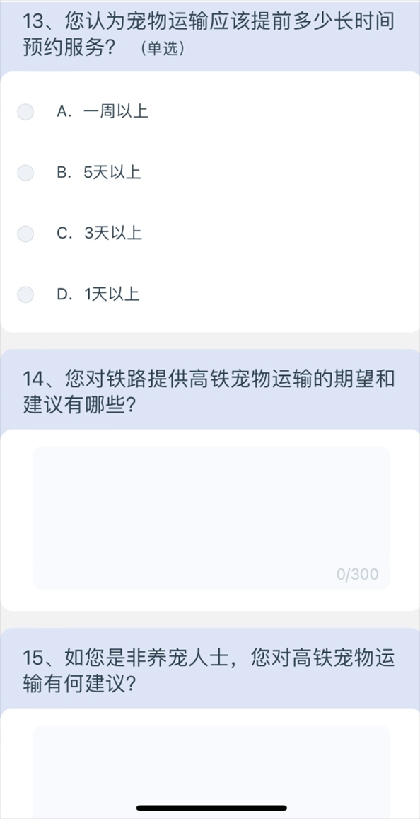 5月10日上午8點(diǎn)40分,澎湃新聞?dòng)浾咄ㄟ^掃描網(wǎng)友分享的列車上的二維碼,進(jìn)入12306系統(tǒng),選擇問卷·建議,進(jìn)入“鐵路旅客高鐵寵物運(yùn)輸”調(diào)查,共15個(gè)問題,涉及養(yǎng)寵類型、是否有攜帶寵物出行的需求、如果鐵路提供寵物運(yùn)輸服務(wù)是否愿意嘗試等,以及為降低對其他旅客的影響,在高鐵寵物運(yùn)輸更關(guān)注哪方面的防護(hù);如鐵路提供高鐵寵物運(yùn)輸服務(wù),期望的定價(jià)標(biāo)準(zhǔn);如鐵路提供高鐵寵物運(yùn)輸服務(wù),最關(guān)注的內(nèi)容;如果是非養(yǎng)寵人士,對高鐵寵物運(yùn)輸有何建議等多方面問題。