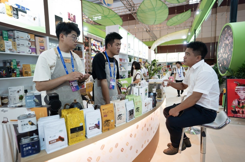 來自云南保山的參展商在第七屆中國—南亞博覽會上向參觀者介紹咖啡產品(2023年8月16日攝)。新華社記者 陳欣波 攝