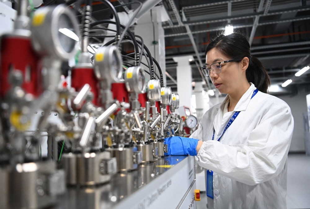 工作人員高巧利在陜西省榆林中科潔凈能源創(chuàng)新研究院工藝放大平臺實驗室制備催化劑小試樣品(2024年2月28日攝)。新華社記者 鄒競一 攝