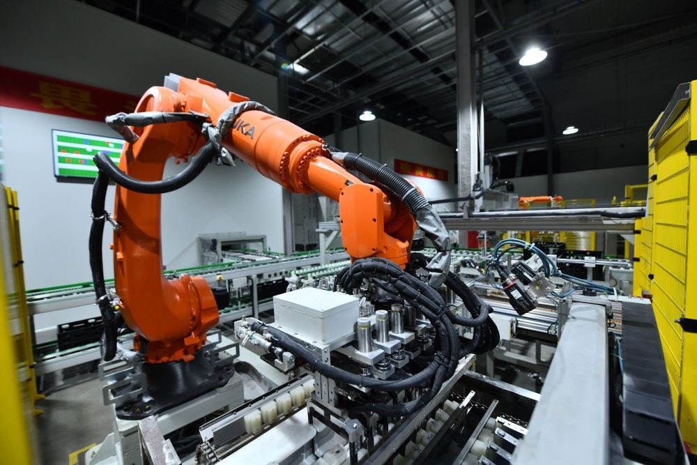 在廣西柳州市一家新能源汽車電池生產企業(yè),機器人在生產線上作業(yè)(2023年5月10日攝)。新華社記者 黃孝邦 攝