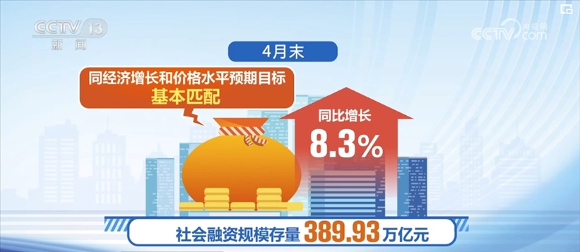 4月末,社會融資規(guī)模存量389.93萬億元,同比增長8.3%,同經濟增長和價格水平預期目標基本匹配。1—4月,社會融資規(guī)模增量累計為12.73萬億元,處于歷史同期較高水平。
