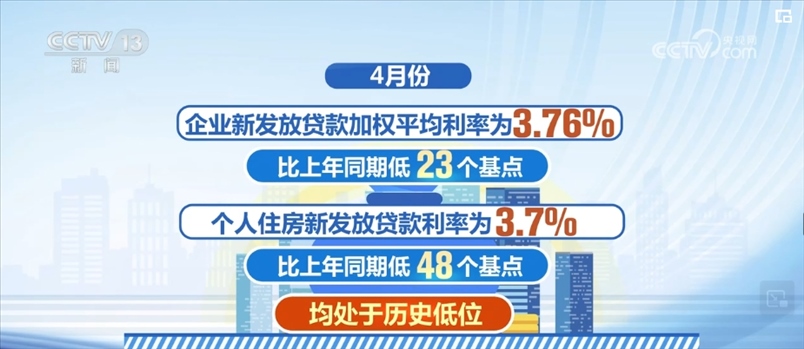 4月份,企業(yè)新發(fā)放貸款加權平均利率為3.76%,比上年同期低23個基點;個人住房新發(fā)放貸款利率為3.7%,比上年同期低48個基點,均處于歷史低位。