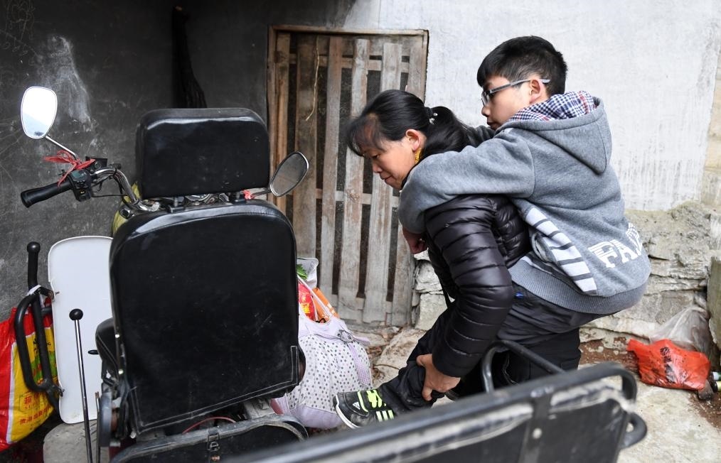 ?↑在廣西東蘭縣隘洞鎮(zhèn)板康村,黃乜鮮背著兒子黃必華上三輪車(2018年2月26日攝)。