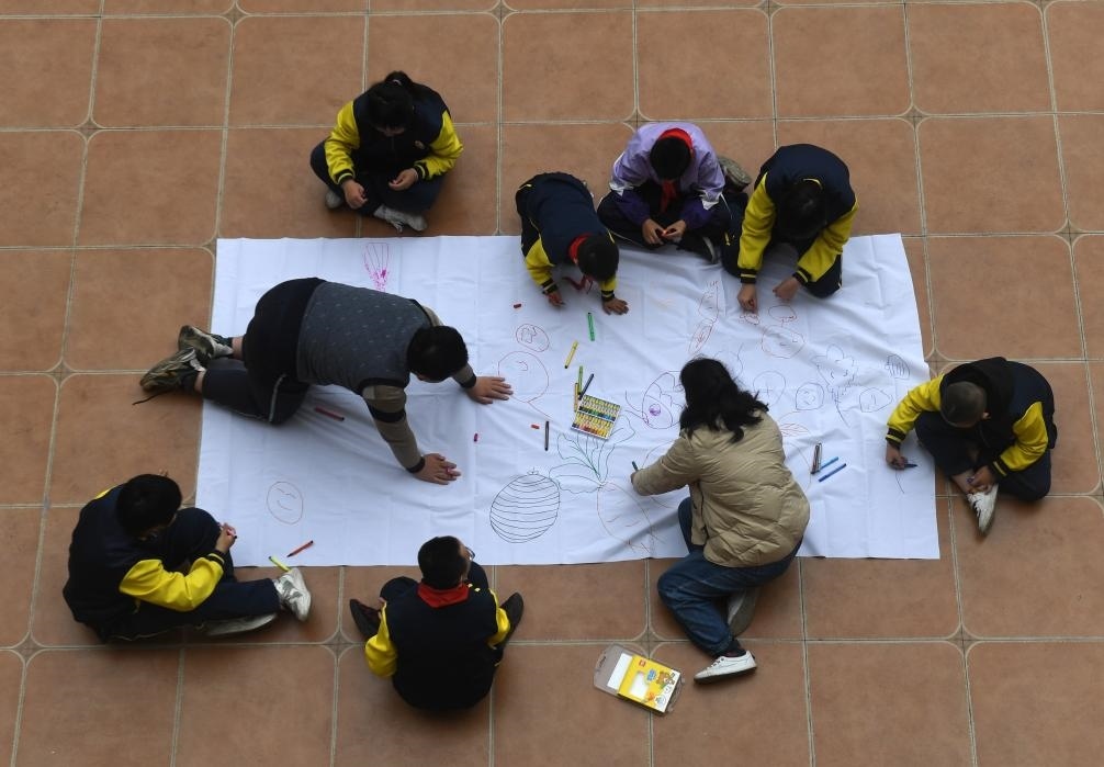 ?↑在廣西南寧高新區(qū)龍華學(xué)校,何冬艷教她照顧的學(xué)生畫畫(2023年3月31日攝)。