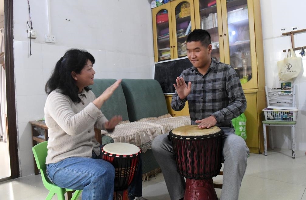 ?↑在位于廣西南寧市北湖北路的出租房里,何冬艷教兒子陽陽打鼓(2023年3月31日攝)。