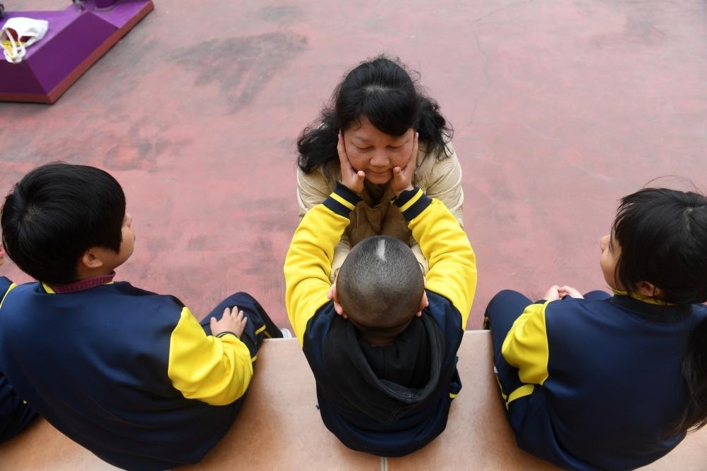 ?↑在廣西南寧高新區(qū)龍華學(xué)校,何冬艷和她照顧的學(xué)生在一起(2023年3月31日攝)。