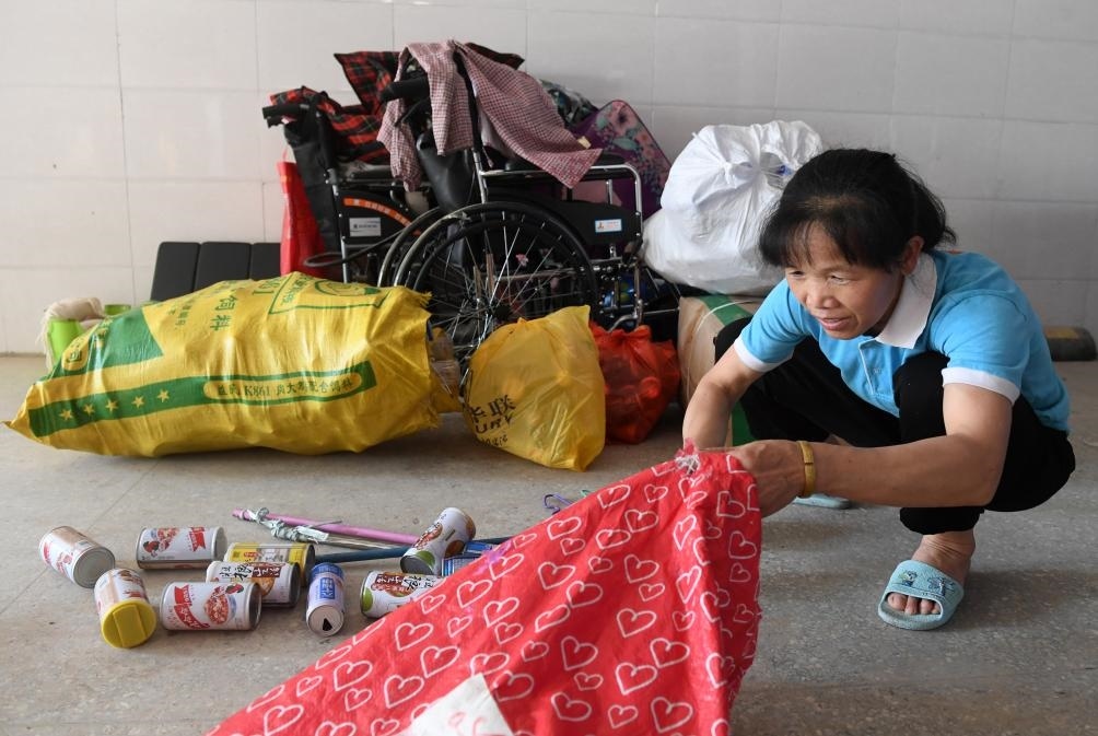 ?↑在廣西東蘭縣高級中學(xué),黃乜鮮在收拾撿回來的廢舊物品(2020年5月9日攝)。