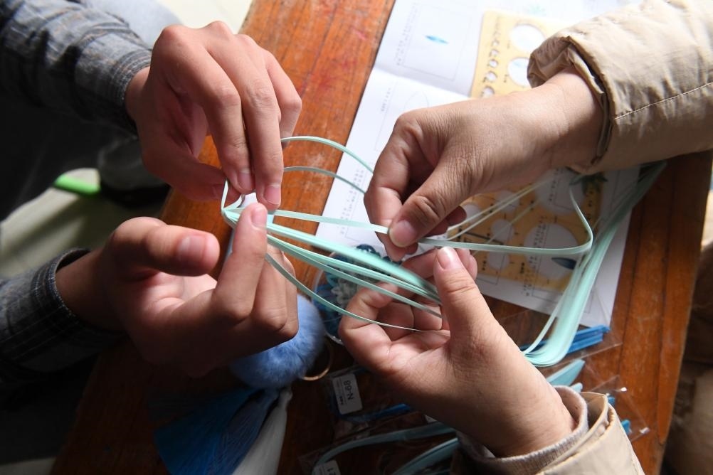 ?↑在位于廣西南寧市北湖北路的出租房里,何冬艷和兒子陽陽在做手工(2023年3月31日攝)。