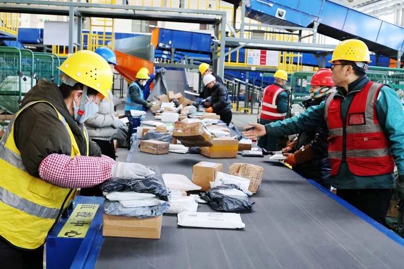 2月15日,中國郵政集團(tuán)甘肅省張掖市郵政寄遞物流共配中心工作人員在分揀包裹。春節(jié)假期,眾多勞動者忙碌在工作崗位上。新華社發(fā)(成林 攝)
