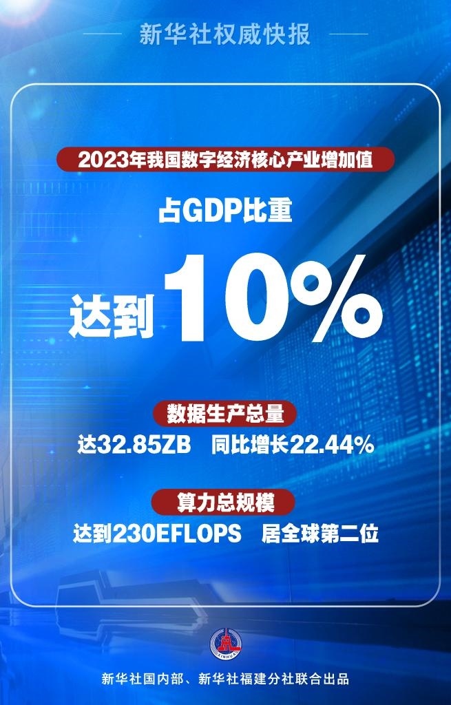 2023年我國數(shù)字經(jīng)濟(jì)保持穩(wěn)健增長,數(shù)字經(jīng)濟(jì)核心產(chǎn)業(yè)增加值占GDP比重達(dá)到10%。數(shù)據(jù)要素市場日趨活躍,2023年數(shù)據(jù)生產(chǎn)總量達(dá)32.85ZB(1個ZB等于十萬億億字節(jié)),同比增長22.44%。數(shù)字基礎(chǔ)設(shè)施不斷擴(kuò)容提速,算力總規(guī)模達(dá)到230EFLOPS(EFLOPS是指每秒百億億次浮點(diǎn)運(yùn)算次數(shù)),居全球第二位。