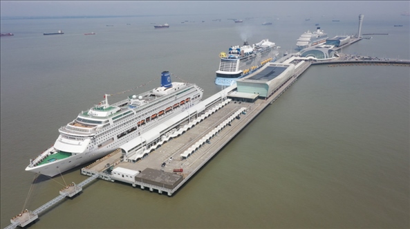 5月22日,“愛達·魔都號”“海洋光譜號”和“鼓浪嶼號”三艘郵輪停靠在吳淞口國際郵輪港(無人機照片)。(上海邊檢總站供圖)