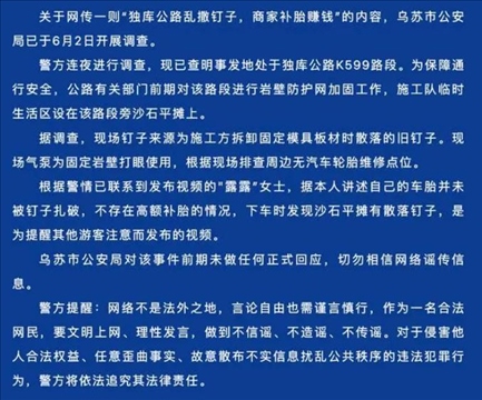 ·新疆烏蘇警方通報(bào)“獨(dú)庫(kù)公路亂撒釘子”:系施工方拆卸板材時(shí)散落,現(xiàn)場(chǎng)排查周邊無(wú)汽車輪胎維修點(diǎn)。