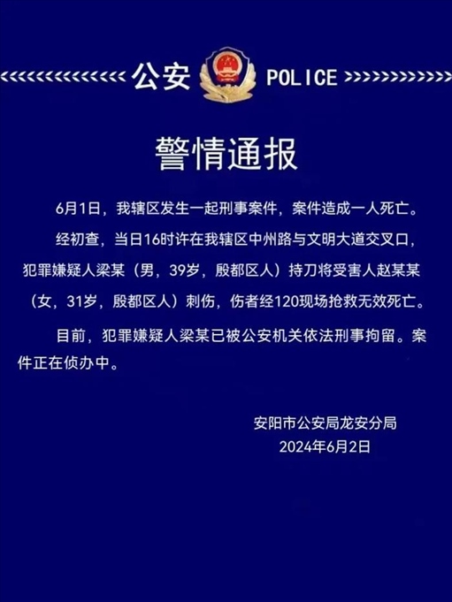 ·河南安陽(yáng)警方:一男子持刀將女子刺傷致死被刑拘。