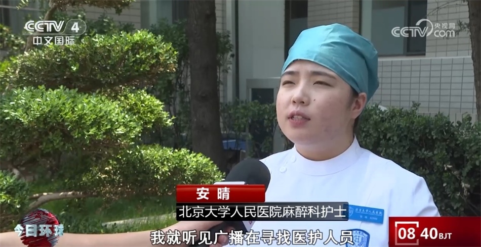 北京大學(xué)人民醫(yī)院麻醉科護(hù)士安晴稱(chēng):“進(jìn)了地鐵閘機(jī)門(mén)之后,我就聽(tīng)見(jiàn)廣播在尋找醫(yī)護(hù)人員 ,我就趕緊從樓梯走了下去。當(dāng)時(shí)患者已經(jīng)沒(méi)有反應(yīng)了,已經(jīng)呼之不應(yīng)了,我就立馬上前查看了一下她的瞳孔,當(dāng)時(shí)瞳孔已經(jīng)散大了,然后摸了一下頸動(dòng)脈的搏動(dòng),也是消失的,我就判定她為心臟驟停,然后緊急對(duì)她進(jìn)行了胸外按壓。”
