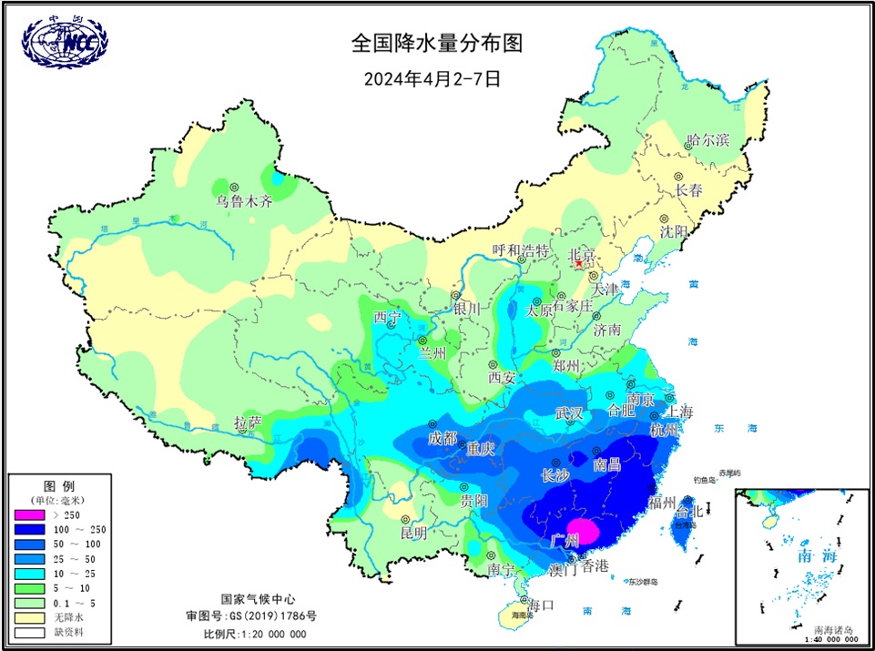 14次區(qū)域暴雨過程襲擊我國,較常年同期明顯偏多。春季,我國共發(fā)生14次區(qū)域暴雨過程,較常年同期偏多3.8次。4月2-7日的暴雨過程為1961年以來同期第八強(qiáng),受其影響,我國華東南部、華中南部、華南東部及貴州東北部、重慶、四川中東部等地累計降水量50~100毫米,浙江西南部、福建、江西南部、湖南東南部、廣東大部等地累計降水量100~250毫米,局地超過250毫米(圖5);湖南茶陵(203.2毫米)、廣東始興(145.3毫米)日降水量超過極端閾值。