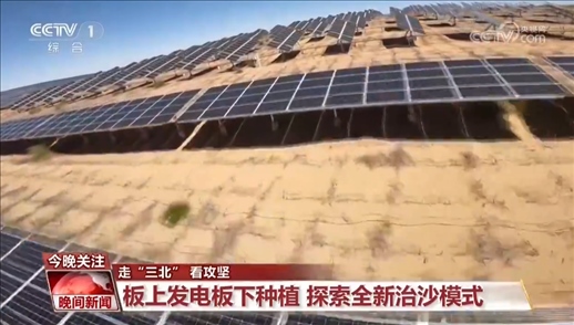 總臺記者 李欣蔓:治沙的腳步不但沒有停,還在不斷探索新的治沙模式?,F(xiàn)在我們看到的是鄂爾多斯一個已經(jīng)建好、并網(wǎng)發(fā)電的光伏項目,板上發(fā)電,板下種植,一個空間全方位利用。三重防線,構(gòu)建起了全新的生態(tài)治沙模式。有一個數(shù)據(jù)值得我們關(guān)注,這里的光伏項目占地39萬畝,與此同時,生態(tài)治理面積也將規(guī)劃完成39萬畝。在國家推進光伏治沙項目開發(fā)建設(shè)的進程中,我們看到越來越多的企業(yè)參與其中,在發(fā)展新能源產(chǎn)業(yè)的同時共同擔(dān)負起治沙的責(zé)任,為一片藍海,一片綠洲的建設(shè),貢獻更多的力量。
