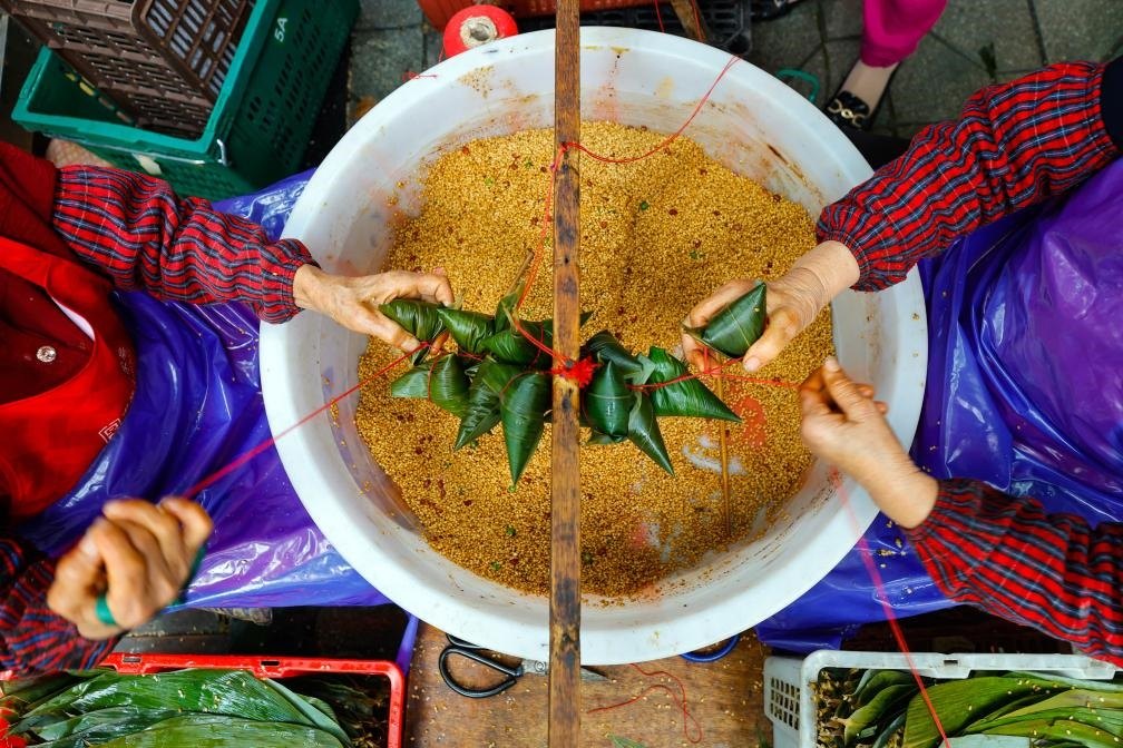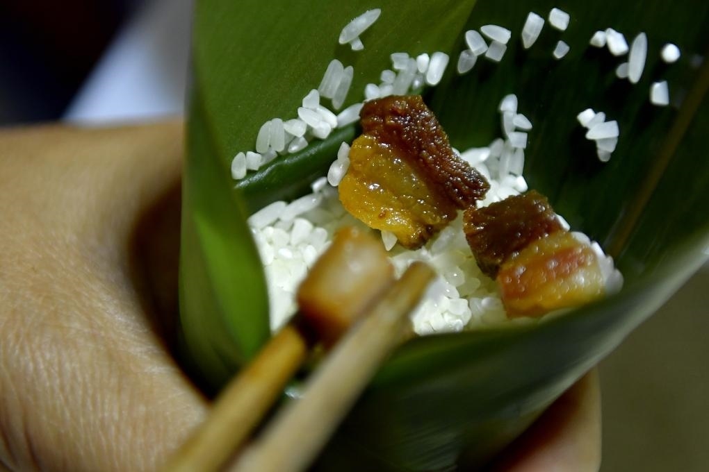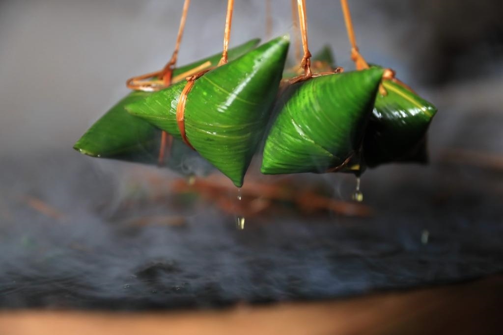 2017年5月24日,湖北省宣恩縣板場村農(nóng)民制作臘肉粽子。