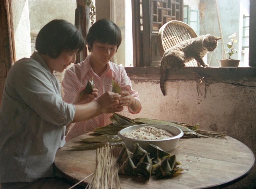 1955年,居住在廣州市華僑眷屬一家人在包粽子。