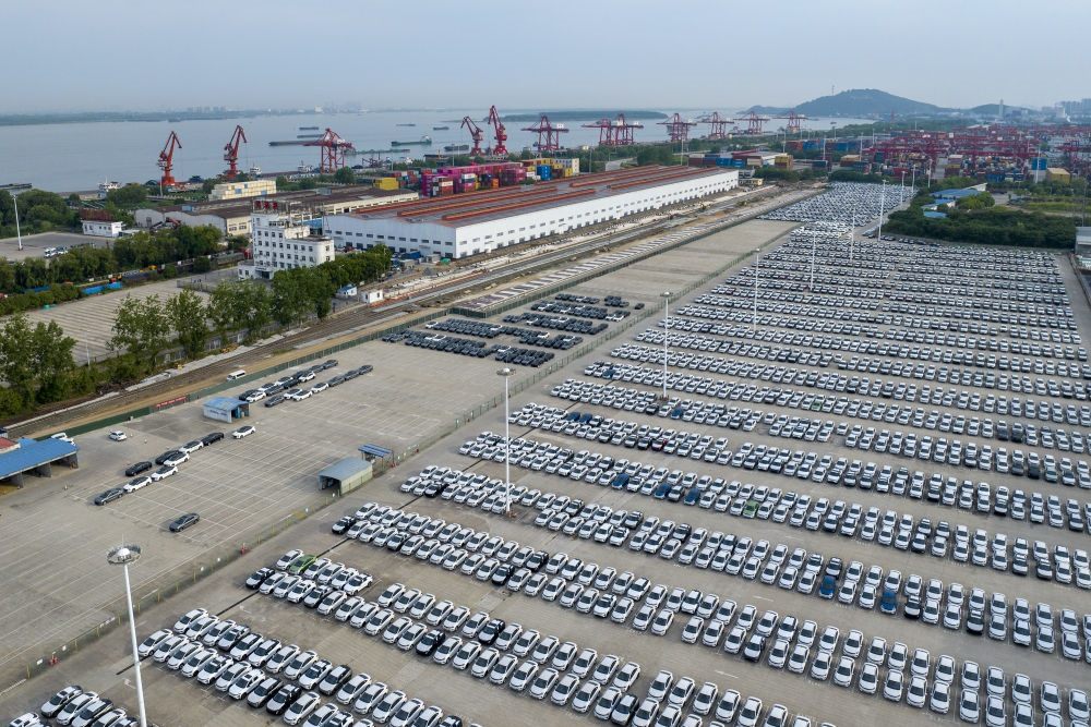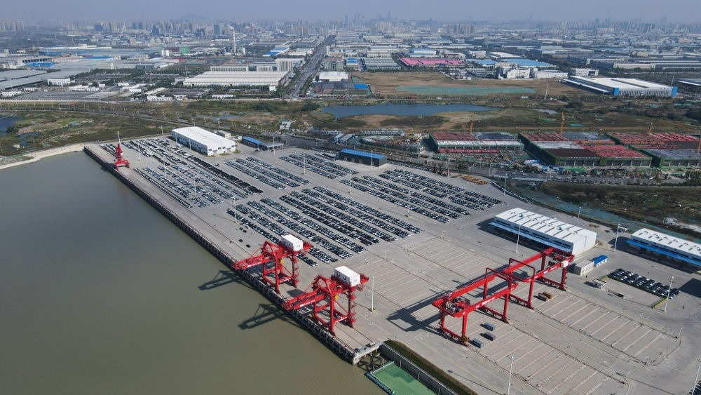 2024年5月26日,在安徽蕪湖港朱家橋港區(qū)國際集裝箱碼頭,整齊排列的汽車等待出口(無人機(jī)照片)。作為安徽省首個(gè)國家一類開放口岸,蕪湖港現(xiàn)已發(fā)展成為長三角城市群綜合交通運(yùn)輸體系的重要樞紐。